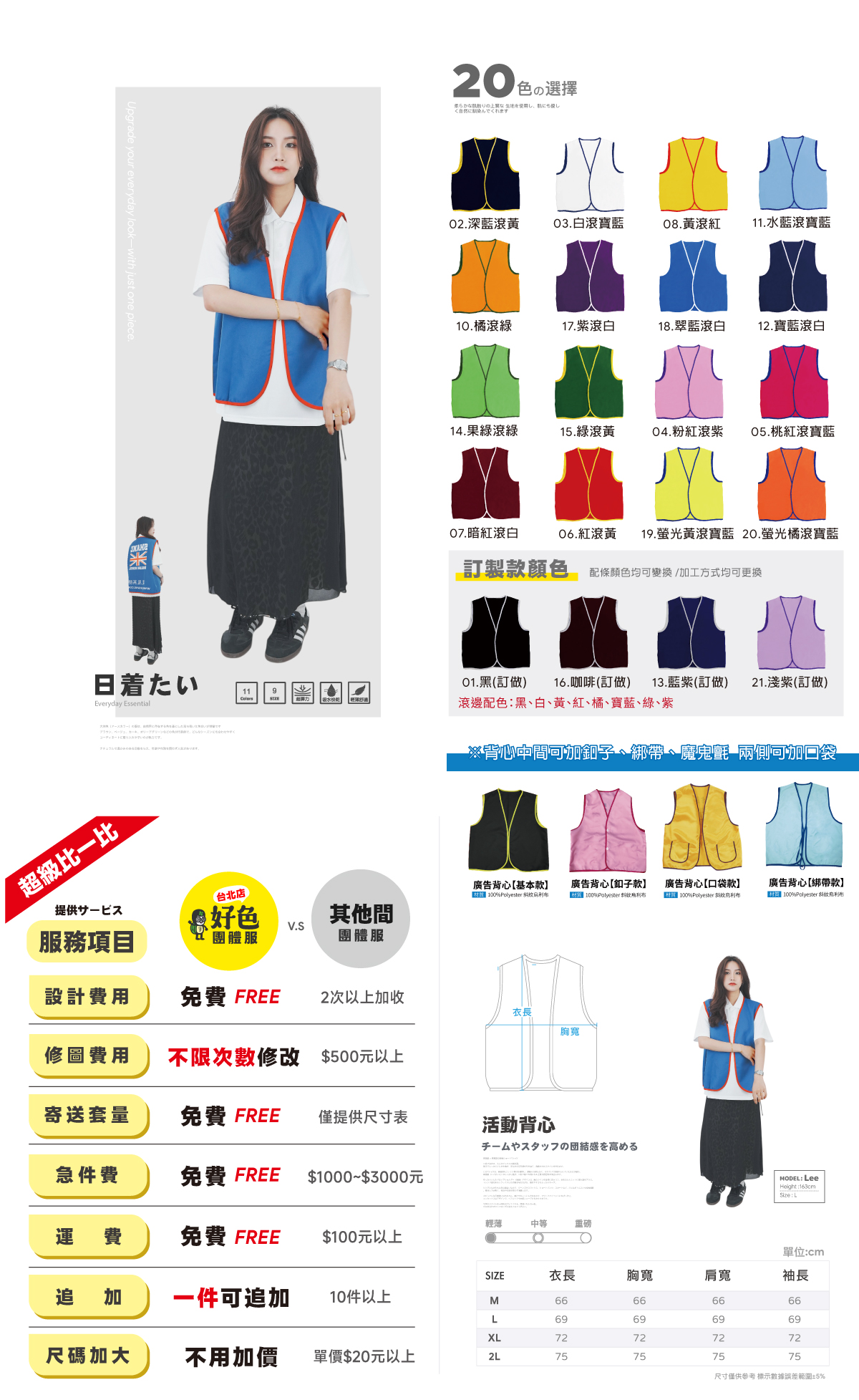 從廣告背心、活動背心到各式機能背心,提供多樣款式與印刷方式,靈活對應不同使用情境。